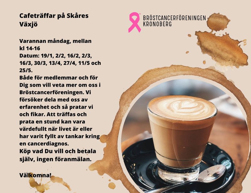 Både för medlemmar och för Dig som vill veta mer om oss i Bröstcancerföreningen. Vi försöker dela med oss av erfarenhet och så pratar vi och fikar. Att träffas och prata en stund kan vara värdefullt när livet är eller har varit fyllt av tankar kring en cancerdiagnos. Köp vad Du vill och betala själv, ingen föranmälan.