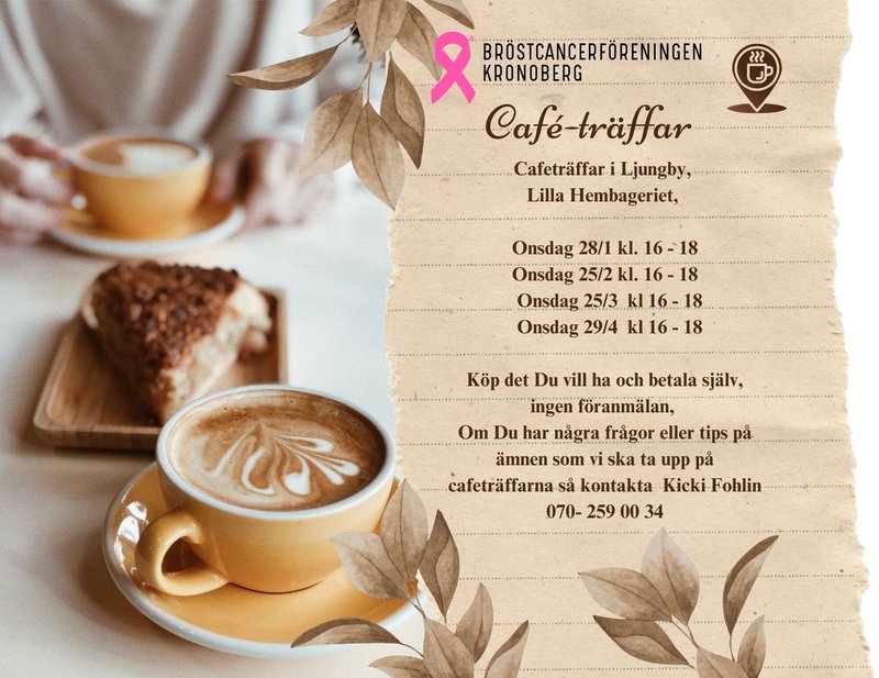 Både för medlemmar och för Dig som vill veta mer om oss i Bröstcancerföreningen. Vi försöker dela med oss av erfarenhet och så pratar vi och fikar. Att träffas och prata en stund kan vara värdefullt när livet är eller har varit fyllt av tankar kring en cancerdiagnos. Köp vad Du vill och betala själv, ingen föranmälan.